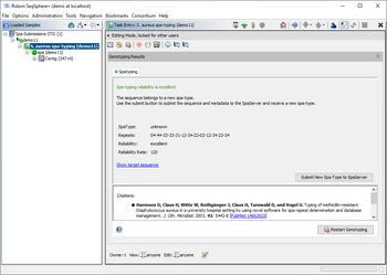 If an unknown spa-type is found and the reliability is "good" or "excellent" (reliability rate >= 95), the new spa-type can be submitted to the SpaServer by using the submission button in the Task Entry overview. Please note that with WGS data new spa-types that contain no new spa-repeat(s) can be submitted only. New spa-types that contain new spa-repeat(s) can be submitted with Sanger data only.