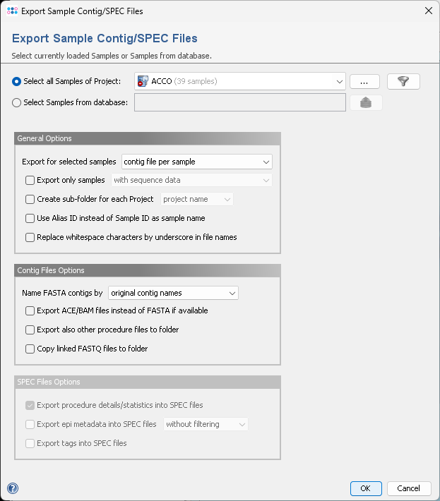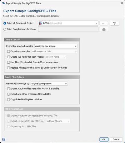 • Export for selected samples contig files and SPEC files / only contig files / SPEC files