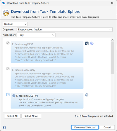 The Task Template Sphere is used in Ridom Typer to download predefined task templates. It provides predefined task templates, e.g., for The Task Template Sphere can be opened by the Download button in the The Task Template Sphere download dialog allows to select an Organism to browse all available task templates for this species. The field Application allows to show only task template with the selected application (e.g., 'Typing'). The cgMLST, Accessory and MLST task templates are preselected by default. When the dialog is confirmed with the OK button, the selected task templates are downloaded, and if invoked from a project editor dialog, they will be added to the project. After the task templates are downloaded, they are locally available in the database and can be used for multiple projects and by multiple users. Task templates will always be downloaded only once. If a task template, that was already downloaded before, is selected in the download dialog, the local copy will be used automatically. The 'NCBI AMRFinderPlus' task template is only available for download on Linux or on Windows with installed Windows Subsystem for Linux client systems. |
