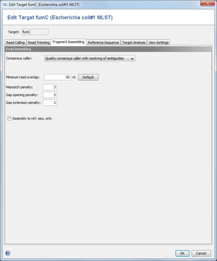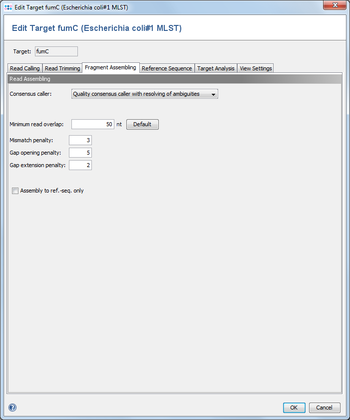 Defines a reference sequence (ref.-seq.) for the target. The main usage of a reference sequence is to orientate and crop a contig and to define variant positions. The reference sequence can be imported from a file or pasted from the clipboard.