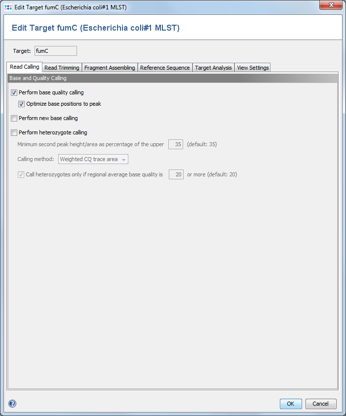 This dialog defines, if Ridom Typer should perform quality/base/heterozygote callings on all chromatograms that are added to a target.