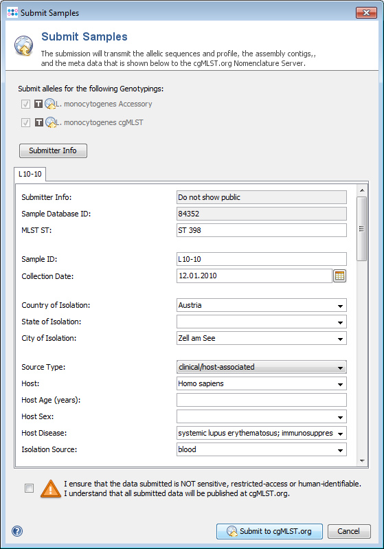The main window menu function File | Assign or Submit new Alleles can be used to assign new alleles to local and global allele libraries. For local allele libraries, the alleles are assigned on the local SeqSphere+ server and no data is submitted to external servers. For global allele libraries that are used by public Task Templates additional meta data is submitted to the cgMLST.org Nomenclature Server together with the allelic profile. |