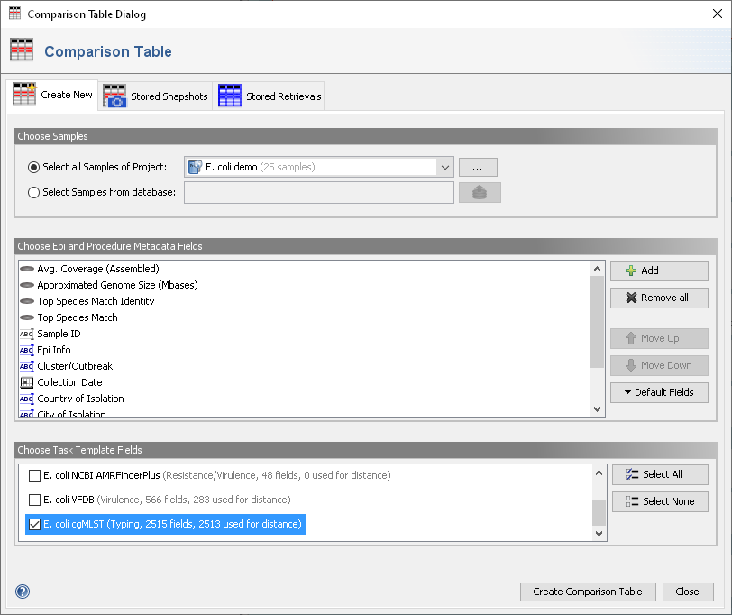 This tab panel can be used to create and open a new comparison table with Samples from a whole Project, a selection of Samples from database (e.g., from multiple Projects or by using other advanced search criteria), or from Samples that are currently loaded. In addition Epi and Procedure Metadata Fields and Task Template Fields that should be included in a Comparison Table can be chosen here. When the newly created comparison table is opened, it retrieves the Sample data from the database. If not stored as a snapshot the comparison table is not permanently preserved.