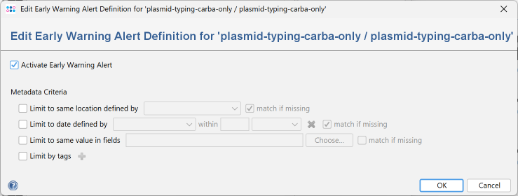 This windows allows to edit an Early Warning Alert (EWA) definition for a Plasmid Typing. Unlike the Early Warning Alerts for cgMLST the plasmid EWAs are defined for a Typing, and not for a Project.