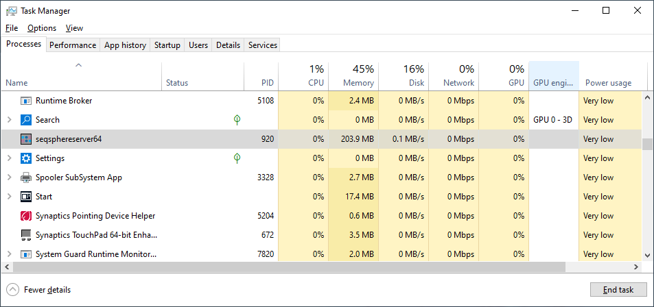 • Step 4: The Processes tab of the Task Manager window shows all running tasks on the computer. Sort the table by the name column, scroll down, and select the task seqsphereserver64.exe.