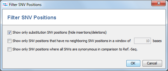 - Filter Settings: The Filter SNV Positions dialog can be used to show only a subset of the SNV positions in the table. Up to three different filter options can be specified: