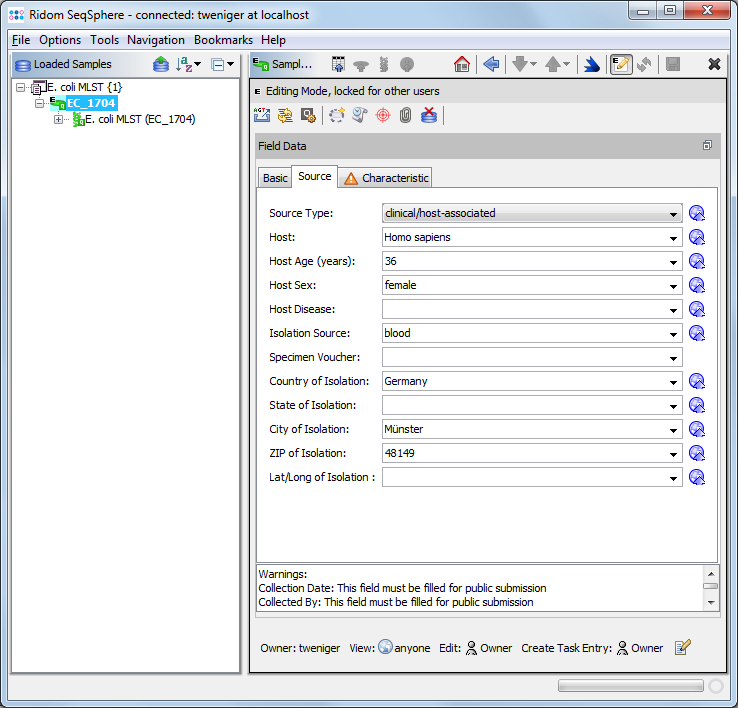 DNA re-sequencing editorWGS data: Assemble data using the integrated de-novo Assembler Velvet or Spades, or the BWA reference mapper. Edit and analyze assembled DNA sequences (e.g., for MLST or cgMLST typing). Auto-correction of homopolymer related InDel errors (Ion PGM & 454 GS Junior). Sanger data: Assemble, edit and analyze Sanger CE sequencing data (e.g., for 16S rDNA or MLST typing). Chromatograms can be automatically assembled into contigs using configurable file naming conventions. DatabaseStore, search, retrieve, export and create reports from your circumstantial information (e.g., place and time) and DNA sequence data stored in an integrated SQL database. Search new sequence entries against stored data. Data fields are compliant with the metadata requirements of the NCBI BioSample. Data entry plausibility checks are possible. Bacterial genotypingTyping of bacteria is automatically performed. Ridom SeqSphere includes support for the following genotyping methods: MLST: Fetch allele numbers for sequences and STs from the PubMLST server or define a local MLST typing, e.g. for using new targets. cgMLST: Extension of MLST that uses thousands of targets, for a gene-by-gene allele typing of NGS data. Resistance, virulence, and serotyping: Genotypic resistance prediction by usage of the NCBI AMRFinderPlus, virulence typing via VFDB (that supports 54 species of medical importance), and Listeria monocytogenes and Escherichia coli serotyping. Automatic NCBI GenBank online queries: Compare the DNA sequences with best matches from GenBank. Single locus queries: Do single locus typing (SLST) and compare against libraries stored in the local database. Quality checkingQuality of DNA data can be automatically checked with user defined target QC parameters (e.g., coverage, intragenic stop codons, frame shifts detection). Analytical toolsSelect data entries from a comparison table for epidemiologic studies, evolutionary or functional analysis. Cluster and visualize data entries by using minimum spanning or UPGMA/Neighbor Joining trees. SecurityEncryption (SSL) of data in transmission. Various configurable user roles, user groups and access controls. Audit trail functionality (who, when and what). CommunityOption to contribute to a single world-wide expanding publically available database of nomenclature and epidemiologic data. Own server for epidemiologic data for larger (supra) national institutions on request. Rapidly and easily share task templates with other institutions or download them online from the Task Template Sphere. |