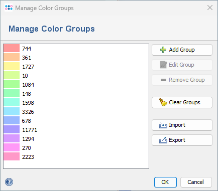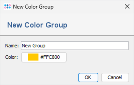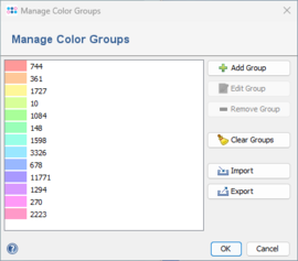 The Comparison Table menu function Data | Manage Color Groups invokes a dialog window that shows all currently defined color groups. It can be used to modify the colors or to add new manually defined groups. The dialog for creating a new group allows to copy and paste colors by right-clicking on the color choosing button. The color groups can also be exported and imported, to store and reuse manually defined color schemes. |