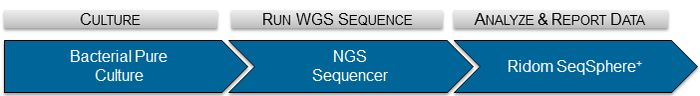 Ridom SeqSphere+Microbial Genomics Software for any Bacteria, any Research Topic, any LabRidom SeqSphere+ Software is designed for distributed work-groups (client/server model) and allows automatic processing and analyzing of NGS (e.g., Illumina, Oxford Nanopore, Ion Torrent, or PacBio) and Sanger capillary- electrophoresis (CE) sequence data. SeqSphere+ is the single solution for easy and automated microbial analysis; enabling your lab to employ whole genome microbial typing (cgMLST) or traditional MLST sequencing projects. Elevate your Microbial Research to the next LevelA variety of methods have been developed to generate isolate-specific fingerprints for epidemiological typing. However, until now there is no single typing method available to address different bacterial population structures (monomorphic vs. panmictic) and all study types (e.g., evolutionary/phylogenetic, population genetics or transmission chain/outbreak). For decades, the common typing method is based on multi locus sequence typing (MLST) of 5-7 housekeeping genes or pulse field gel electrophoresis (PFGE) and multi locus VNTR analysis (MLVA). Although widely adopted, these methods either lack discriminatory power or are labor intensive and difficult to standardize. Now, microbiologists everywhere can experience the genomic revolution that benchtop next generation sequencing (NGS) provides. With fast affordable microbial whole genome shotgun (WGS) next generation sequencing and automatized software analysis, microbiologists can use genome-wide hundreds/thousands of genes (cgMLST) for typing, resulting in extremely high discriminatory power. Such a power coupled with rapid and simple NGS workflows (Figure), makes this complete solution ideal for everyday microbial monitoring to studies. That is, one disruptive technology that fits any bacteria, any study type and any laboratory. SeqSphere+ WGS Workflow |