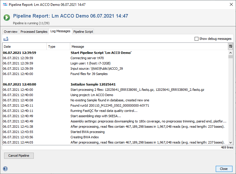 Processed SamplesShows a table with all Samples that were processed, even if they failed and were not imported. Double-click or use the The columns of the table contain important QC fields and, if defined in the project, the results for the Early Warning Alerts and Local Single Linkage Clustering IDs. Log MessagesAll log messages that were reported while the pipeline was running. The log messages for each Sample are also added to the Sample and are shown in the Procedure tab of the Sample Overview. ScriptShows an overview of the pipeline script and allows to export the script. The export is useful if you want to transfer a script to another SeqSphere+ client computer to run it concurrently for scaling up. |