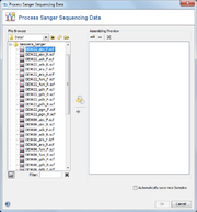 By default only chromatogram files are shown in the browser. Use the Assembling PreviewThe Assembling Preview on the right side is used to arrange reads into different Samples, Task Entries and targets before performing the assembling. The Use the file browser to navigate to your sequence files or to an upper directory, and select the files or the directory to which they belong to. Sort Reads into TargetsPress the button A new dialog window will appear. Select the Project to which the sequences should be added. The task selection can normally be left to automatically. According to the file naming conventions, the software now tries to sort the read files into Samples, Task Entries and targets. The result is shown in the preview table: each row stands for one read file. By default the file naming conventions are taken from the selected Task Template. To use other file naming conventions, select Match by ad hock File Naming and press the Create File Naming button to define a new file naming on the fly. If the sorting was successful, click the OK-button to create the previewed Samples. Control the ResultThe assembling preview panel shows a preview of the Samples to which the sorted reads will be added. If the sample name that was extracted from the file name of a read file matches an existing Sample in the selected Project, then the read is added to this Sample. Read files can thus be added to existing Samples by using corresponding file names. The result list on the right shows the newly added reads highlighted yellow, and the already existing reads highlighted blue. Clicking the OK-button starts the assembling process and opens the Samples in the main window. |