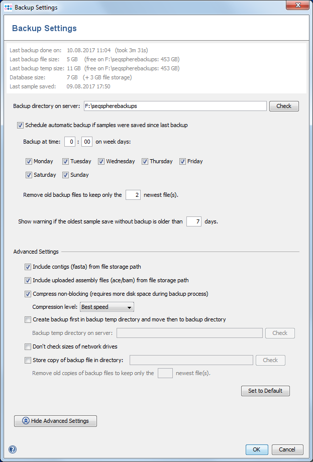 - If enabled uploaded assembly files (ace/bam) from the file storage path are included in the backup file. Default is enabled.