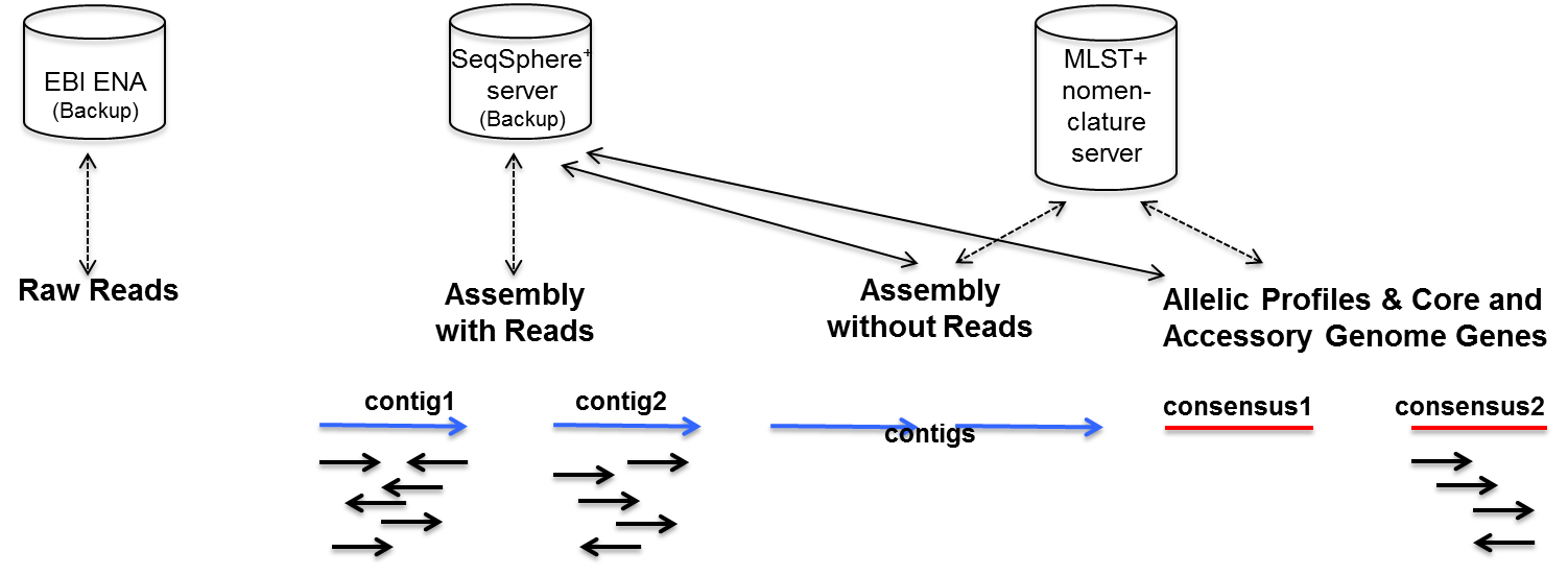 needed for ENA submission (e.g., publication) and different assembly strategy; not stored or managed by SeqSphere+, only file location of processed read files is stored; reads must be stored on a network drive to be accessible for all client computers.