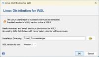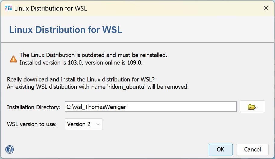The WSL version that was used for the previous installation is pre-selected. Click OK to download and install the new Ridom Linux distribution.