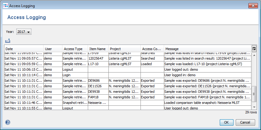 The access logging can only be configured and viewed by the Administrator (or any user with administration rights) by invoking the menu item Button16-SysAdminManager.png Administration | Server System Administration. The button Server Logging opens a drop down menu with functions to Enable server access logging and to Show server access logging.