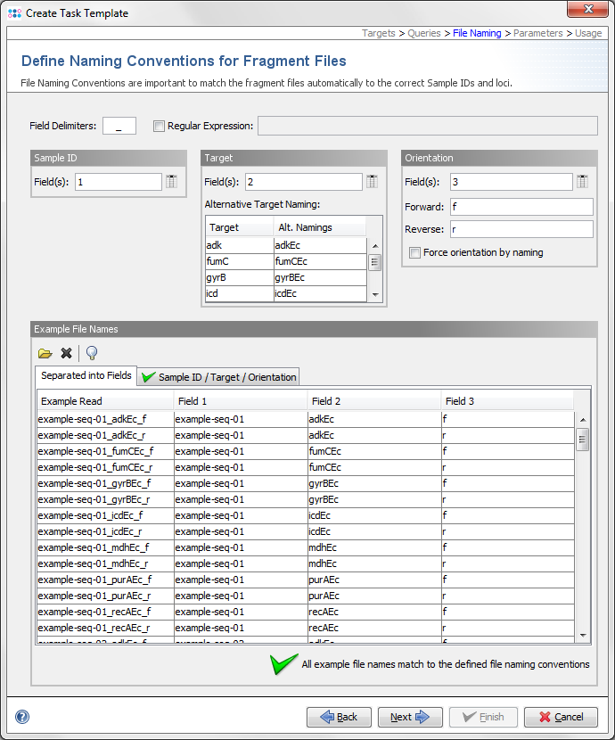 The File Naming that is used by your read files must be defined to import them in a batch mode. If you have added some example files in the step before, SeqSphere+ tries to detect the file naming automatically.