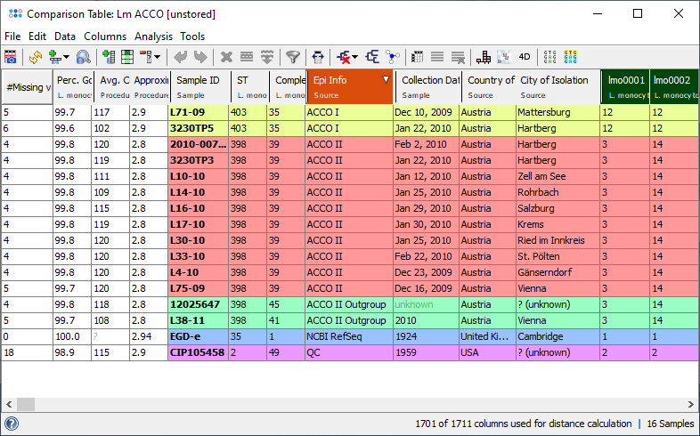 Comparison Table. The column that is used for coloring the samples has a red background in the header (Epi Info), the columns that are used for distance have a green background.