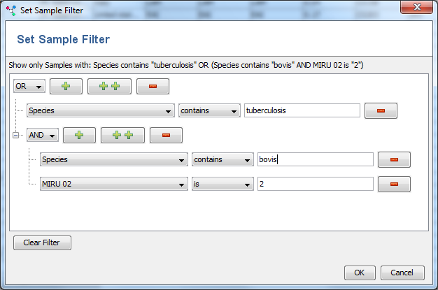 • SampleFilter.png Set Sample Filter: Opens a window to select a filter. Only Samples that match the filter criteria (e.g., coverage, etc.) are displayed in the table and used in distance calculations. Clear filter to reconstitute all Samples again