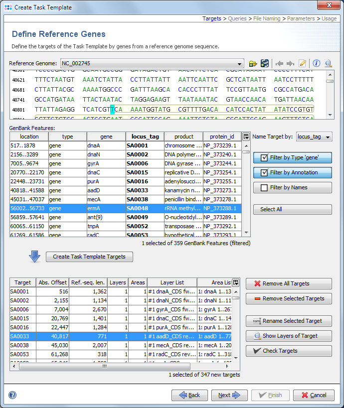 After the genome sequence is successfully loaded, the list of features that were found are listed in the table below the sequence. These features can now be used to define targets in the Task Template. See the NCBI documentation for a more detailed description of the meaning of different feature annotations.